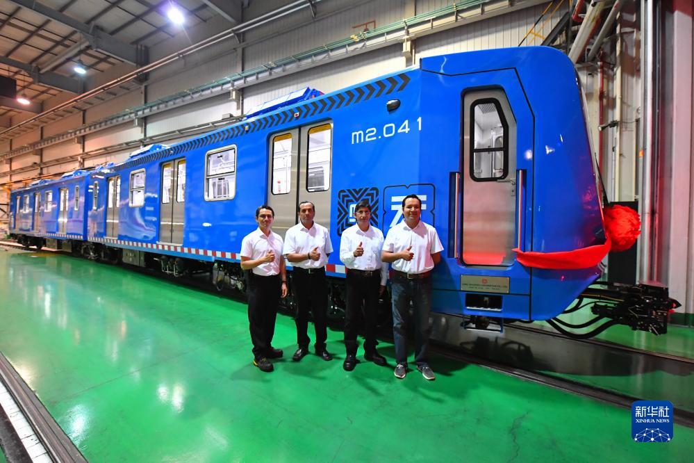 墨西哥來賓在中國中車出口墨西哥城輕軌列車首列車旁合影(9月9日攝)。