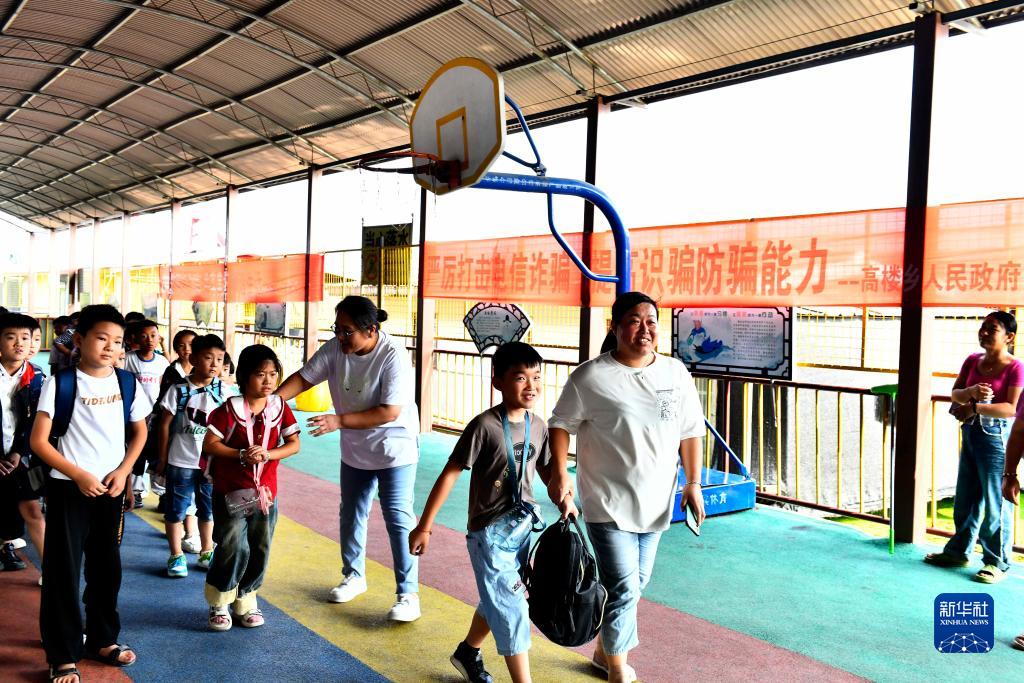 9月5日,在微山縣高樓鄉渭河小學,家長接孩子放學。