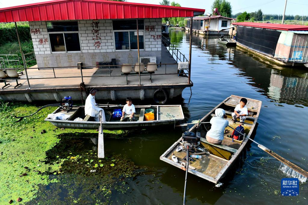 9月5日,在微山縣高樓鄉渭河小學,放學后家長劃船接孩子回家。