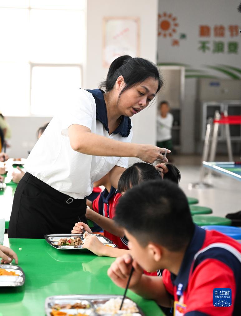 在海南(??冢┨厥饨逃龑W校,符堯惠在餐廳為學生系好頭發(9月6日攝)。