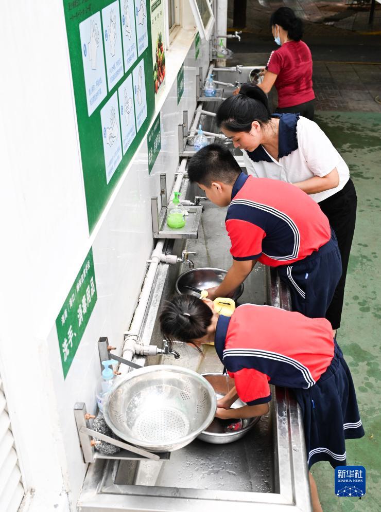 在海南(??冢┨厥饨逃龑W校,符堯惠(后)指導學生在吃過飯后清洗餐具(9月6日攝)。