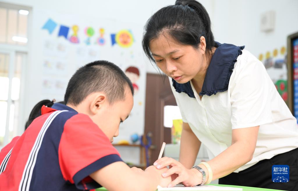 在海南(??冢┨厥饨逃龑W校啟智三(1)班,班主任符堯惠(右)指導學生寫字(9月6日攝)。