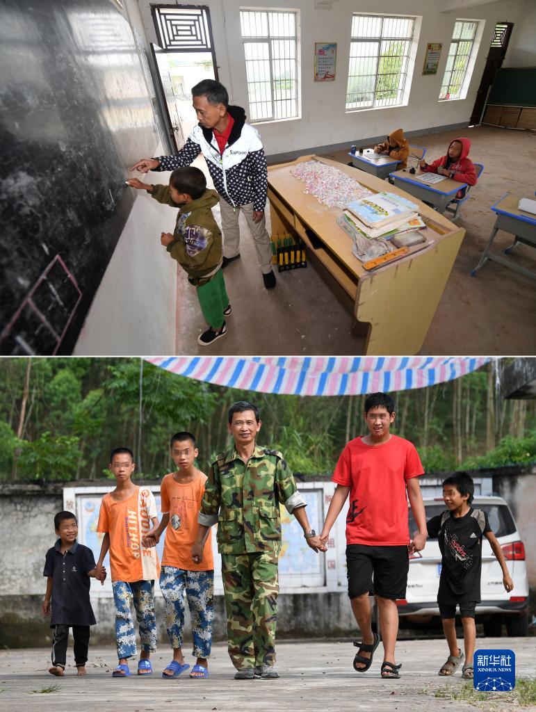 拼版照片:廣西上思縣那琴鄉中心小學逢通村教學點的梁志雄老師給學生上課(上圖,2019年11月19日攝),梁志雄老師和學生課后走在校園里(下圖,2021年6月16日攝)。梁志雄老師2005年被調到那琴鄉中心小學逢通村教學點,這里到2017年僅剩梁志雄和三名殘障學生。2020年8月,梁志雄老師光榮退休。但三名殘障學生無法升學到其他學校就讀,梁志雄接受返聘繼續留守。2021年2月,逢通村教學點又來兩名殘障學生,這個教學點成了梁志雄老師和5個殘障學生“一師五生”的學校。