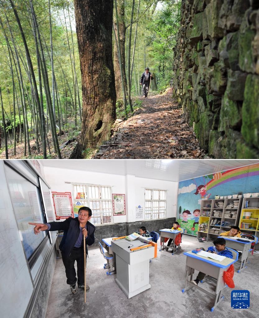 拼版照片:在廣西靈川縣海洋鄉,秦興國走在去中心岐教學點的路上(上圖,2013年3月27日攝)。秦興國老師在廣西靈川縣海洋鄉安泰教學點給學生上課(下圖,2021年10月28日攝)。秦興國是廣西靈川縣海洋鄉一名山區學校老師,因小兒麻痹癥致右腳殘疾。從教近30年來,他拄著拐杖已輾轉海洋鄉4所大山學校。