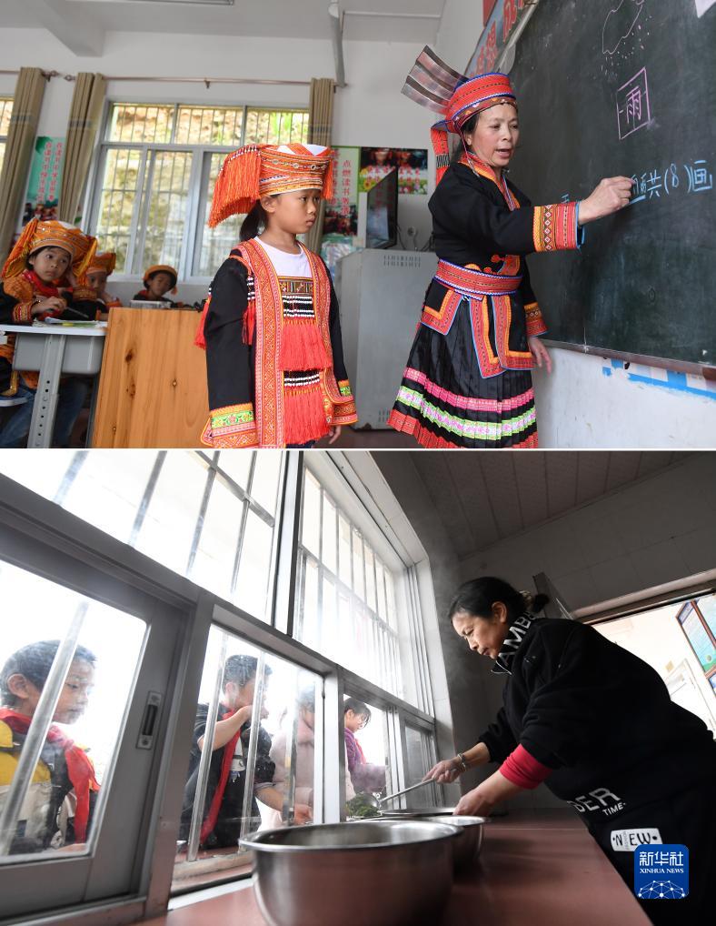 拼版照片:廣西金秀瑤族自治縣忠良鄉山界教學點的陶鳳英老師指導學生做課堂作業(上圖,2019年6月4日攝),陶鳳英老師給學生分菜準備吃午飯(下圖,2023年3月15日攝)。陶鳳英是廣西金秀瑤族自治縣忠良鄉山界教學點的老師,在近40年教書生涯里,她先后在9所大山教學點工作過,除了給學生上課,還要給他們做營養午餐。陶鳳英2019年入選“中國好人榜”。