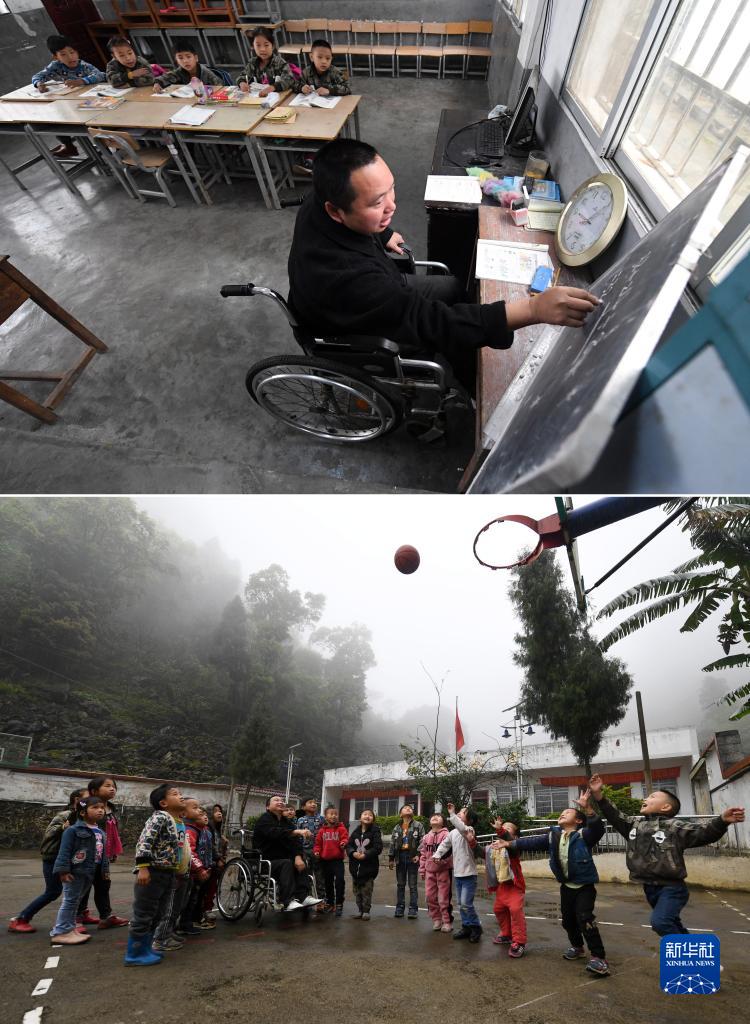 拼版照片:廣西凌云縣下甲鎮河洲村念恩小學的阮文憑老師給學生上課(上圖),阮文憑老師在課間和學生一起玩籃球(下圖)(2019年3月26日攝)。阮文憑老師因小兒麻痹癥致雙腿嚴重萎縮,坐著輪椅堅守大山講臺近30年,2010年獲得“中國青年五四獎章”。
