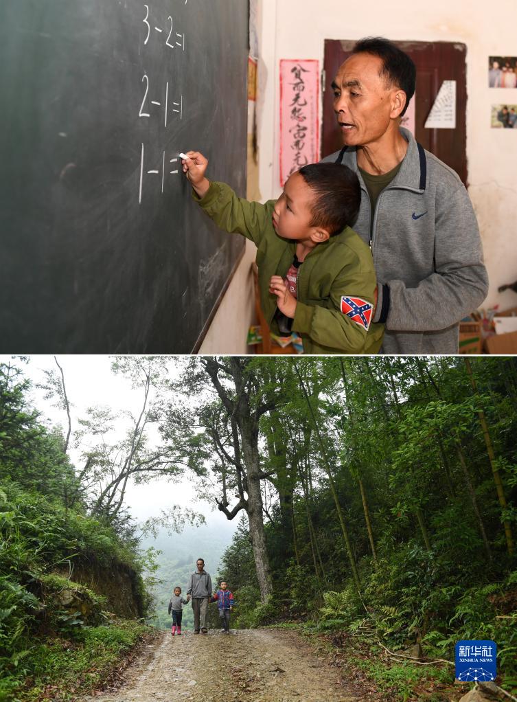 拼版照片:廣西融水苗族自治縣汪洞鄉新合村達佑教學點的周宏軍老師抱著一名身高不夠的學生在黑板上做課堂作業(上圖),周宏軍老師領著學生走在去學校的路上(下圖)(2019年5月28日攝)。周宏軍老師堅守講臺46年。2010年以前,這里不通公路,學校教學用品和學生學習用品都是他用一根扁擔從40公里外的鄉里挑進大山,因此被稱為“扁擔教師”。2018年,他退休后接受返聘又回到講臺上。周宏軍先后獲得“柳州市優秀鄉村教師”“廣西優秀鄉村教師”等榮譽,2014年榮登“中國好人榜”。