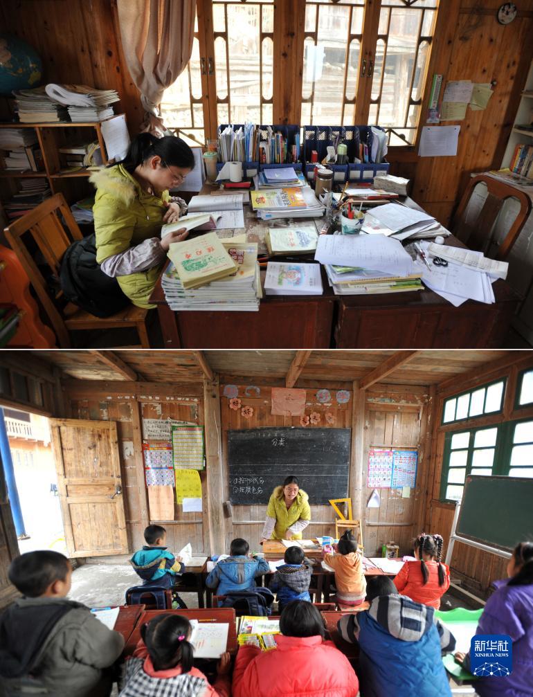拼版照片:廣西龍勝各族自治縣龍脊鎮小寨村小寨希望小學的賴丁來老師在備課(上圖),賴丁來老師給學生上課(下圖)(2014年3月13日攝)。生長在廣東省廣州市增城區的賴丁來2011年來到小寨村成為一名教師,至今仍然堅守在龍脊鎮教書育人講臺上。