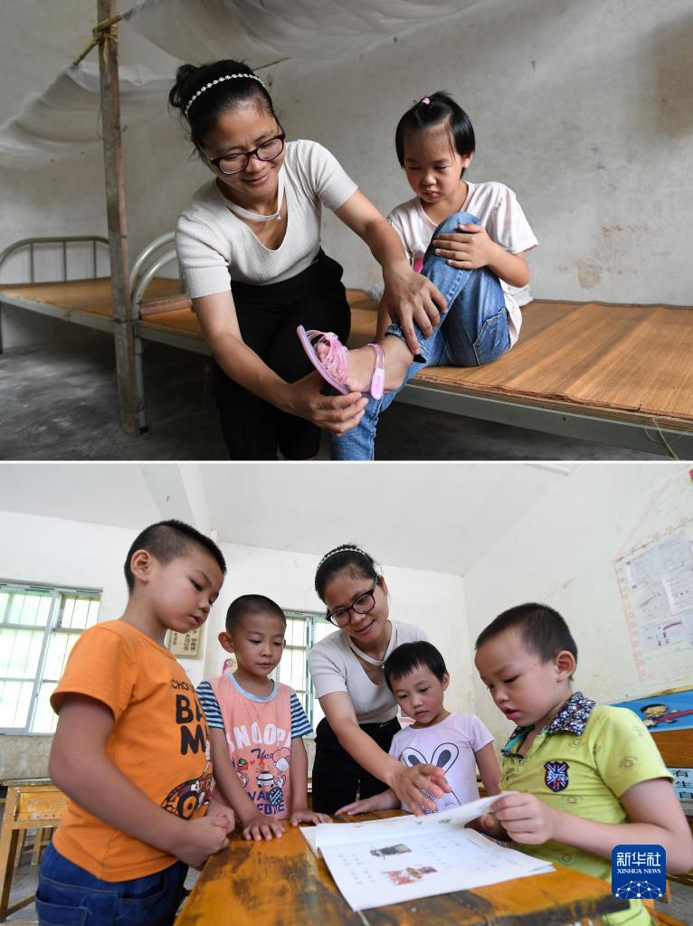 拼版照片:廣西都安瑤族自治縣龍灣鄉琴棋小學的藍巧春老師幫一名學生脫鞋準備睡午覺(上圖),藍巧春老師課間輔導學生功課(下圖)(2017年8月31日攝)。1988年出生的藍巧春畢業后曾在南寧市工作。聽到家鄉招聘教師后,她回到了大山。由于有學生寄宿學校,她每天除了給學生上課,還要給他們做飯,照顧他們的起居。