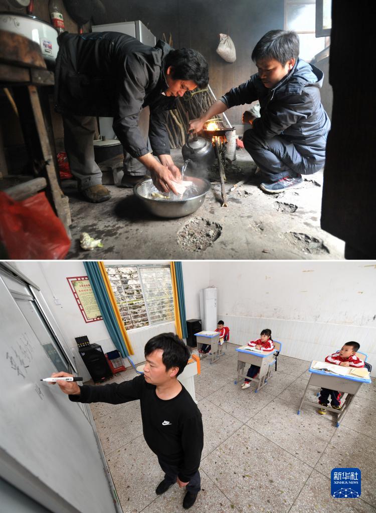 拼版照片:廣西靈川縣海洋鄉中心岐教學點的蔡教宏老師(右)和同事洗肉給學生做午餐(上圖,2013年3月27日攝),蔡教宏老師給學生上課(下圖,2023年5月17日攝)。蔡教宏是廣西靈川縣海洋鄉中心岐教學點唯一的教師,1978年出生,在這所教學點教書已經22個年頭。