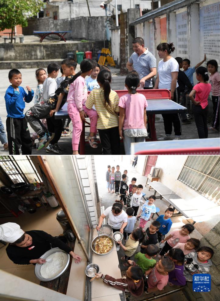 拼版照片:廣西德??h東凌鎮那王小學的黃永勇和黃秀碧課間和學生在一起休息(上圖),黃永勇(左一)和黃秀碧在給學生分午餐(下圖)(2023年3月22日攝)。廣西德??h東凌鎮那王小學地處山區,學校只有黃永勇和黃秀碧這對“夫妻檔”老師。在這里,他們倆除了給學生上課,為學生做午飯,晚上還要照顧離家較遠住校的學生,只有周末才能回家。