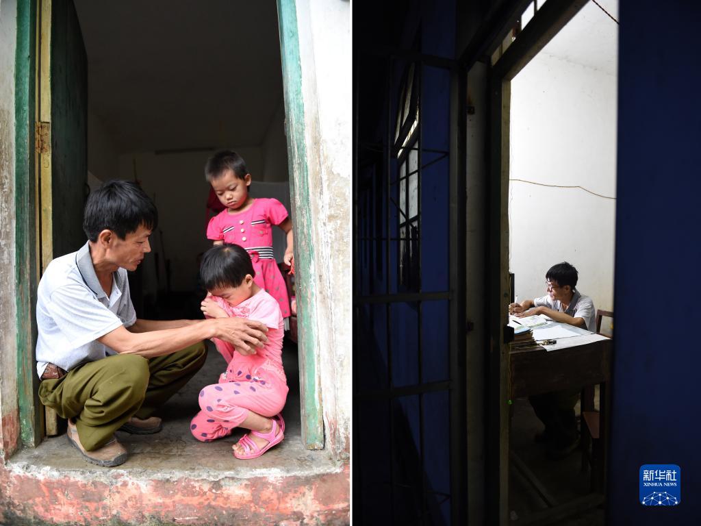 拼版照片:廣西東蘭縣三石鎮泗爺小學的黃英雄老師在安慰一名因想家而哭泣的寄宿生(左圖),黃英雄老師在備課(右圖)(2014年9月10日攝)。2014年,時年50歲的黃英雄老師已在大山里工作28個年頭,泗爺小學當時有學生31名,分3個教學班,教師只有黃英雄一個人。