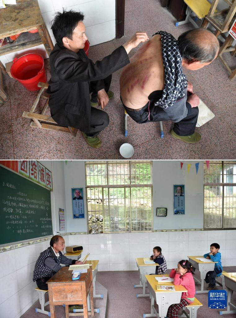 拼版照片:在廣西全州縣東山瑤族鄉金雞源教學點,盤榮在給父親盤紹衛老師(右)刮痧(上圖),金雞源教學點的盤紹衛老師在課堂上(下圖)(2016年4月27日攝)。時年62歲的盤紹衛是廣西全州縣東山瑤族鄉金雞源教學點唯一的老師,因暫時沒有新老師來接替他的崗位,他接受返聘回到已經堅守41年的講臺。