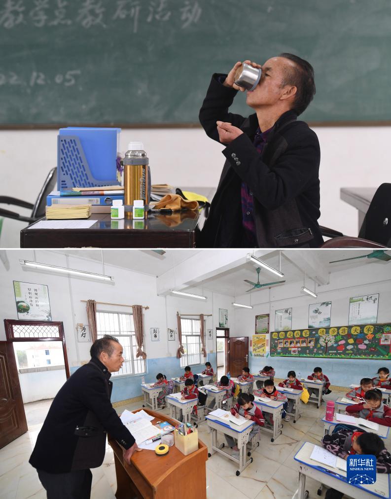 拼版照片:廣西賓陽縣王靈鎮中心學校七新教學點的王英紅老師在吃藥(上圖),王英紅老師給學生上課(下圖)(2023年2月22日攝)。王英紅老師2017年9月被診斷患有原發性肝癌,隨后做肝腫瘤切除手術。2018年7月,病情基本穩定后,他主動提出回學校工作,每天堅持帶著抗癌藥給學生上課。