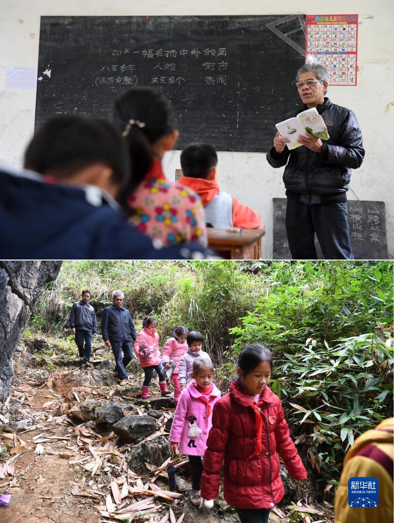 拼版照片:廣西大新縣寶圩鄉那排教學點的覃誠老師給學生上課(上圖),覃誠老師(左二)和同事覃永忠老師(左一)陪學生走山路回家(下圖)(2017年11月24日攝)。時年54歲的覃誠在邊境學校工作已經26年。因患上視網膜血管炎,左眼視力為0.3,右眼視力僅為0.01,但為了學生課程不落下,他堅持每天吃藥帶病上課。