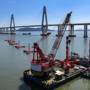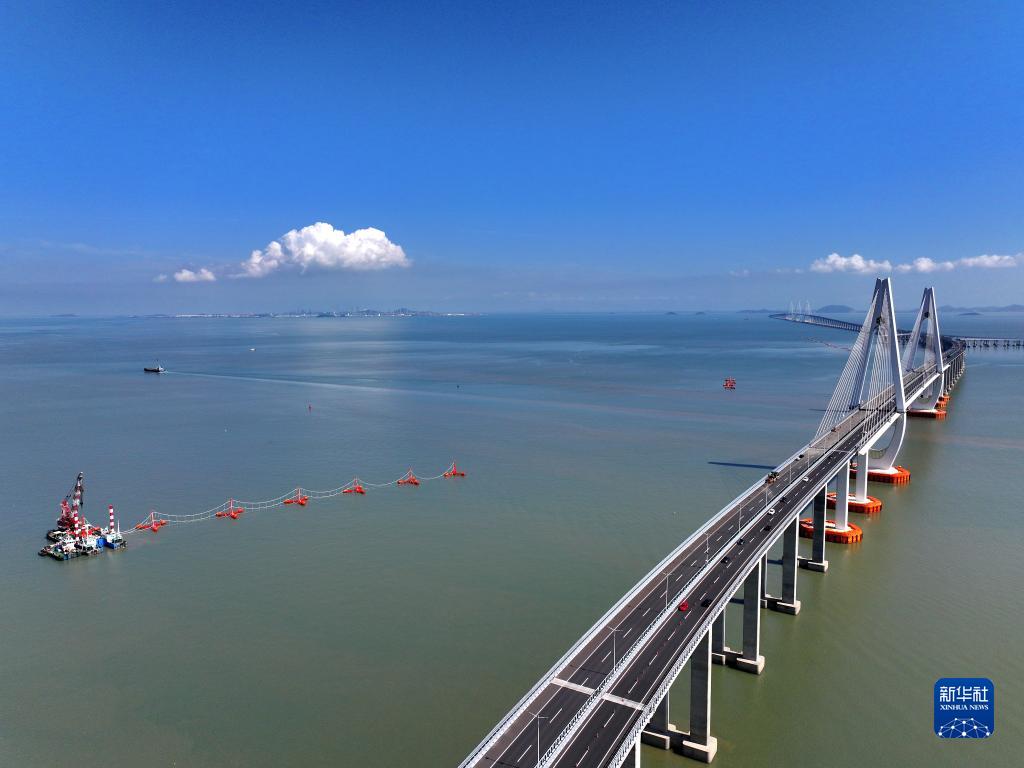 9月10日,一艘工程船在舟山市定海區馬目海邊為舟岱大橋南通航孔橋安裝防船舶撞擊系統(無人機照片)。