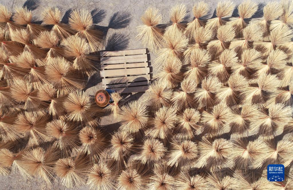 9月10日,在湖南省婁底市雙峰縣石牛鄉一竹制品生產企業,工人在晾曬竹制半成品(無人機照片)。