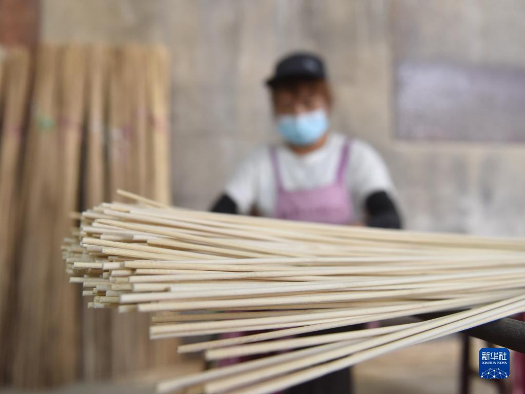 9月10日,在湖南省婁底市雙峰縣石牛鄉一竹制品生產企業,工人在加工竹筷子。