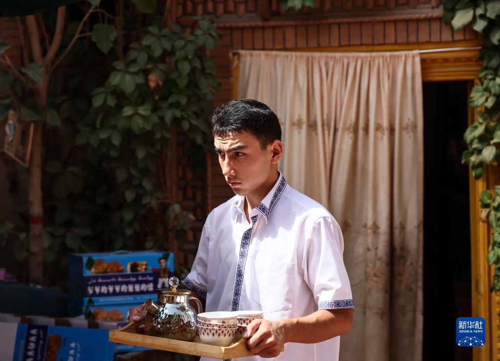 在新疆喀什古城景區“爺爺的爺爺的爸爸的馕”打馕店,工作人員端著托盤從屋內走出(9月7日攝)。