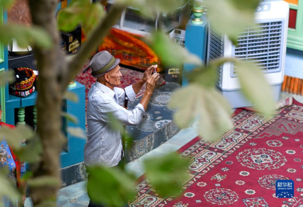 在新疆喀什古城景區“古麗的家”旅游家訪點,游客在觀光拍照(9月7日攝)。