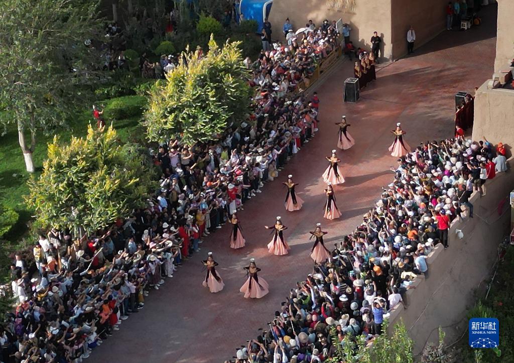 游客在新疆喀什古城景區東門觀看開城儀式表演(9月8日攝,無人機照片)。