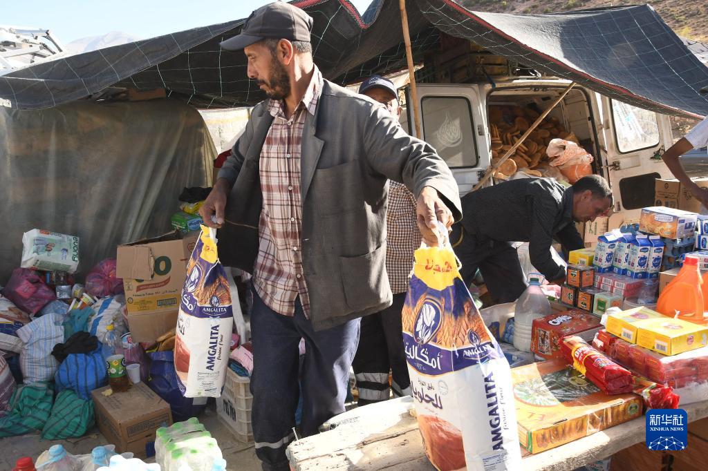 9月10日,在摩洛哥震中附近的艾茲魯村,工作人員分發救援物資。