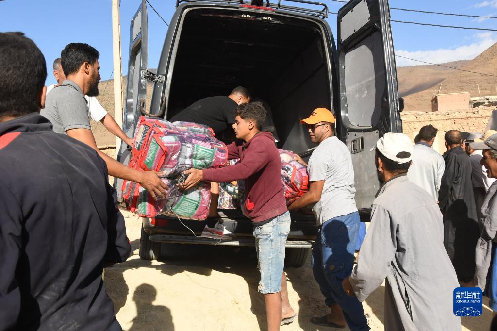 9月10日,在摩洛哥震中附近的艾茲魯村,人們搬運救援物資。