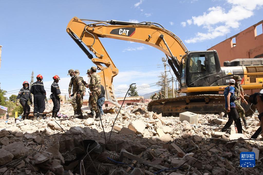 9月10日,在摩洛哥震中附近的艾茲魯村,救援人員在倒塌建筑上實施搜救。