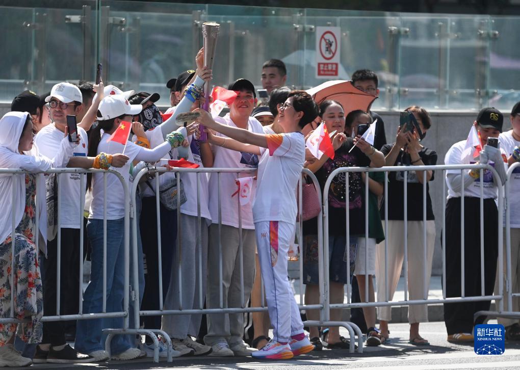 9月11日,火炬手屠紅燕在火炬傳遞后與觀眾互動。
