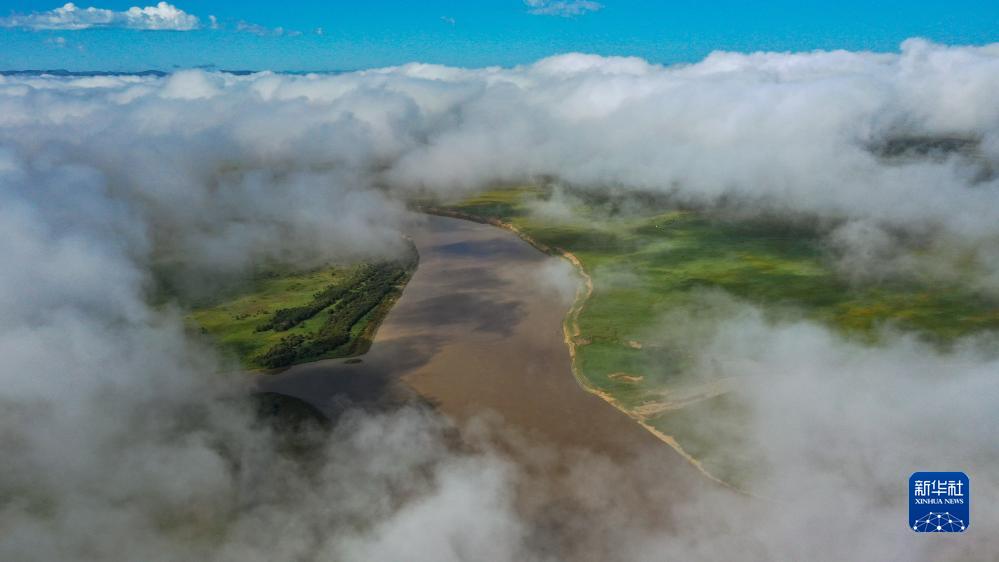 這是8月22日清晨在四川省阿壩藏族羌族自治州若爾蓋縣唐克鎮拍攝的黃河九曲第一灣景色(無人機照片)。