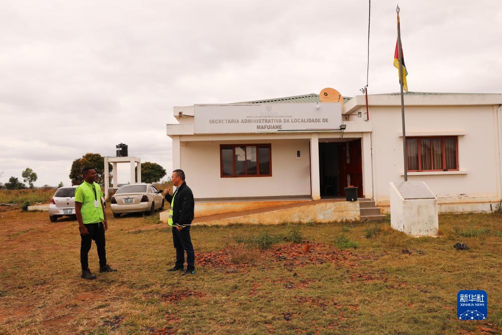 7月25日,在莫桑比克馬普托省馬富亞內村,瓜達吉亞(左)與四達時代莫桑比克分公司運營總監朱海清在裝有中國援助的衛星電視接收天線的房屋前交流。