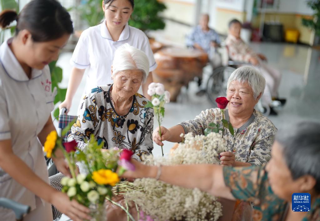 9月11日,在河北省灤州市王店子鎮海洋養老中心,醫務人員和老人們一起練習插花藝術。