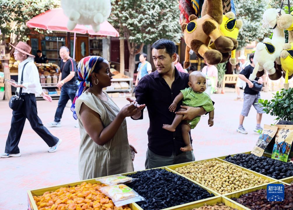 迪力夏提抱著孩子和海迪雅在喀什古城景區的一家店鋪前挑選美食(9月7日攝)。