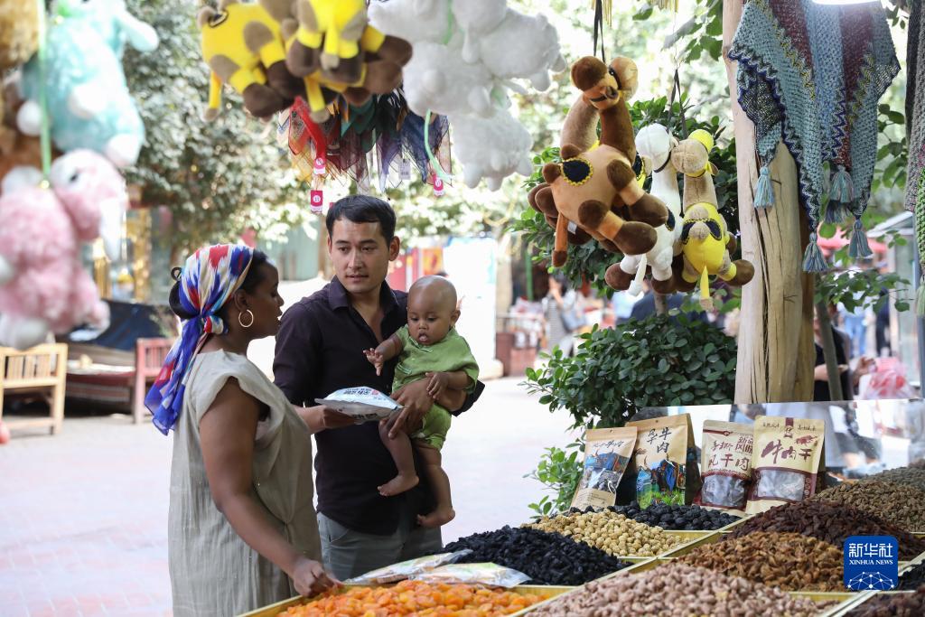 迪力夏提抱著孩子和海迪雅在喀什古城景區的一家店鋪前挑選美食(9月7日攝)。