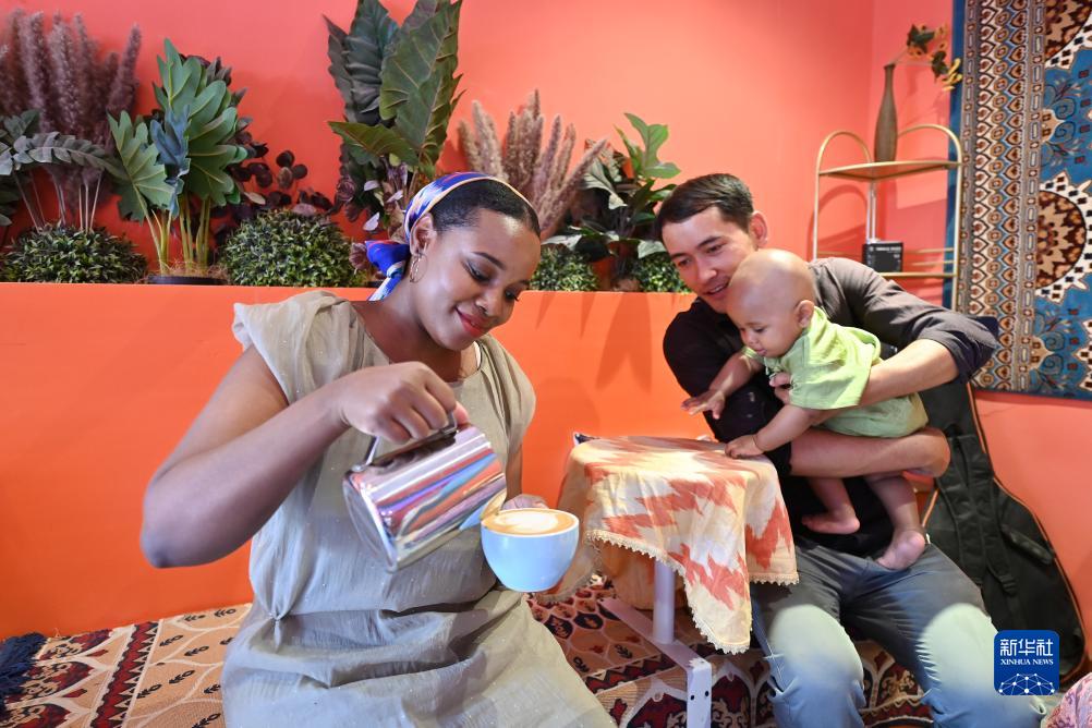 海迪雅在自家咖啡館內為顧客制作咖啡,丈夫迪力夏提抱著孩子伴其身旁(9月7日攝)。