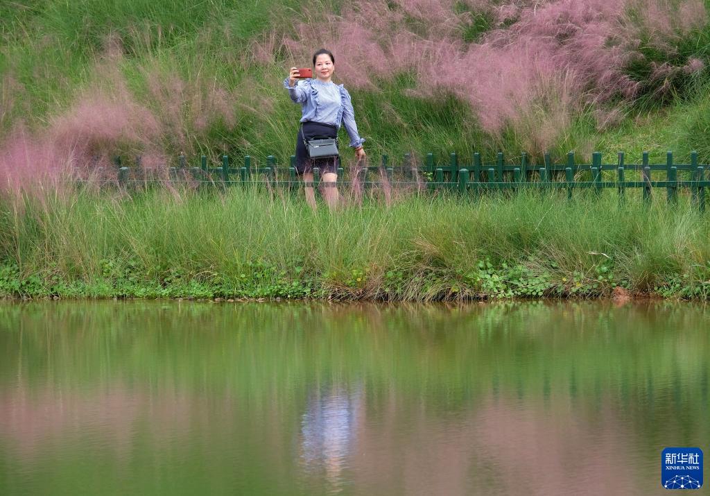 9月11日,一名游客在廣西南寧市園博園粉黛亂子草叢旁自拍。