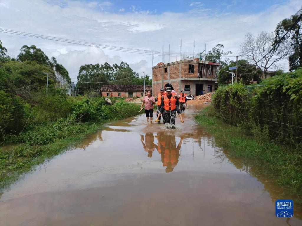 9月11日,在廣西北海市合浦縣白沙鎮那郊村,救援人員轉移受災群眾(手機照片)。