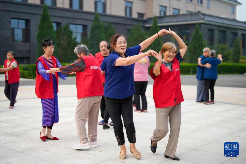 9月12日,河北省唐山市古冶區一家養老機構的老人們在院子里運動。