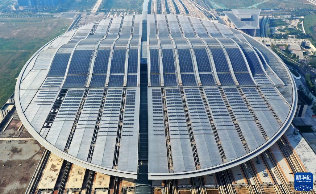京雄城際鐵路雄安站站頂分布式光伏電站(2022年9月9日攝,無人機照片)。