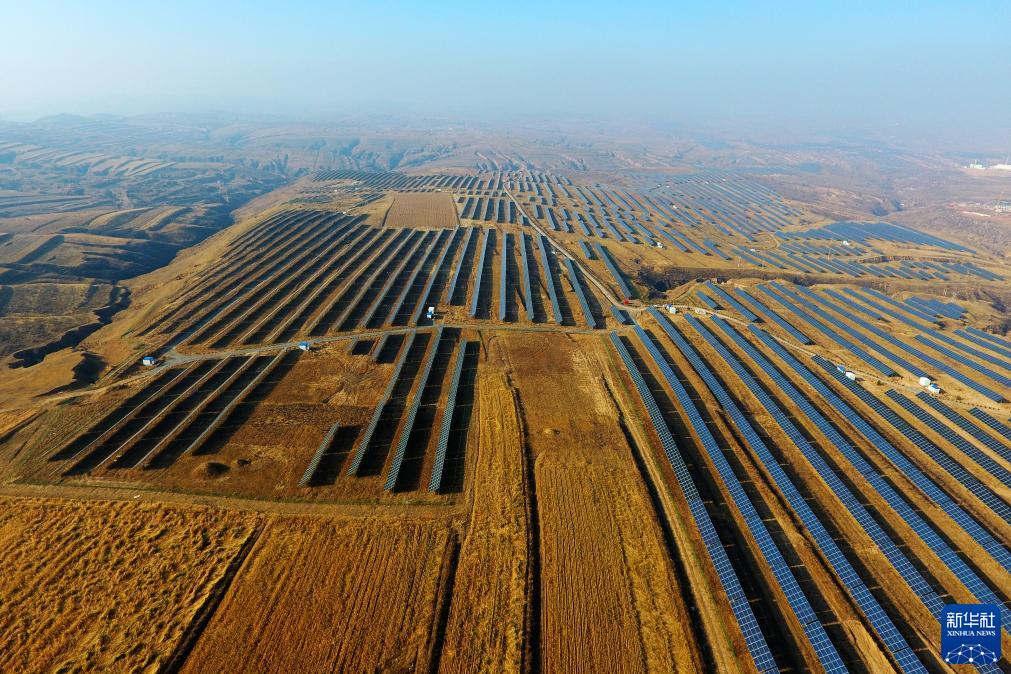 俯瞰山西大同采煤沉陷區國家先進技術光伏示范基地項目大同京能10萬千瓦光伏項目一角(2016年11月16日攝,無人機照片)。