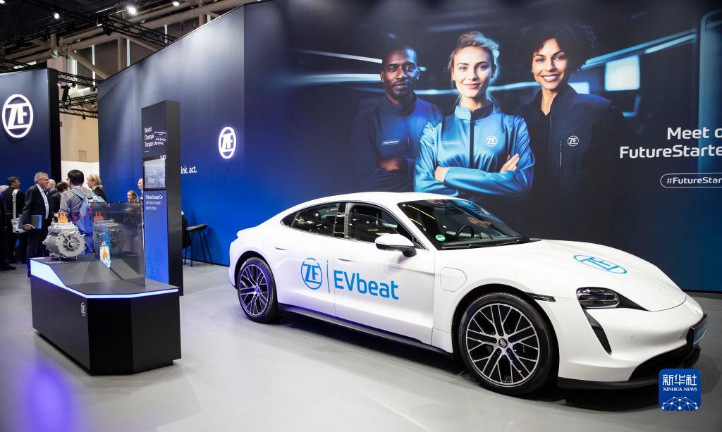 這是9月4日在德國慕尼黑舉行的2023年德國國際汽車及智慧出行博覽會媒體預展上拍攝的采埃孚展區。