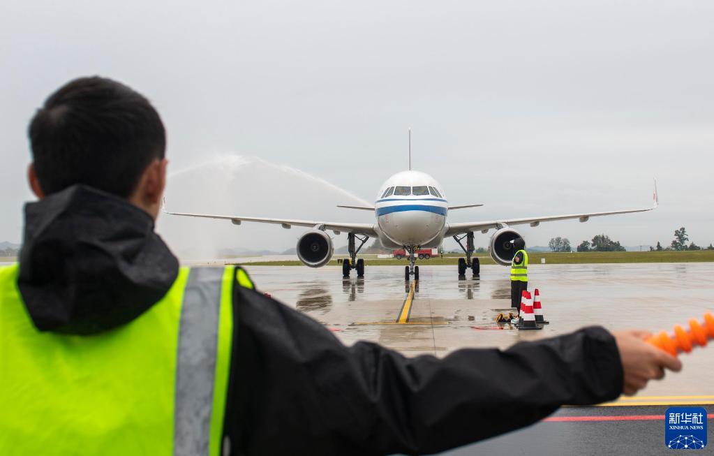 9月12日,在四川省閬中市閬中古城機場,工作人員引導國航空客A319飛機降落滑行。