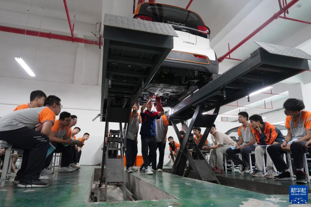 9月12日,在重慶市北碚區職業教育中心新能源汽修實訓室,教師(中)在給學生講解新能源汽車維修知識。