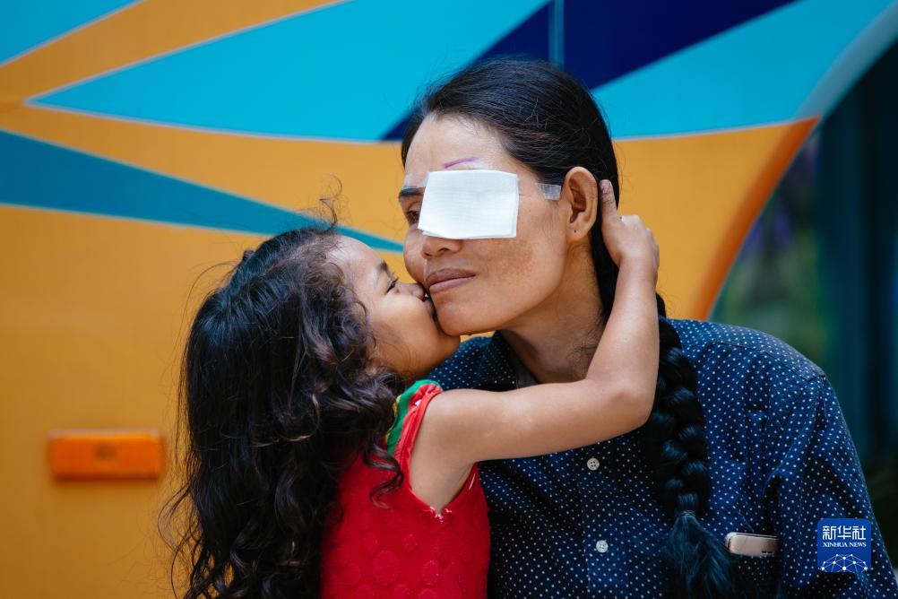 這是2019年3月15日,在柬埔寨磅湛省醫院,即將接受白內障手術的患者孫美樂接受女兒的親吻祝福。孫美樂是柬埔寨一名貧困的單身母親,左眼患上白內障幾近失明。在接受了中國醫療隊的白內障義診手術后,她的視力逐步恢復,生活有了新的光明和希望。