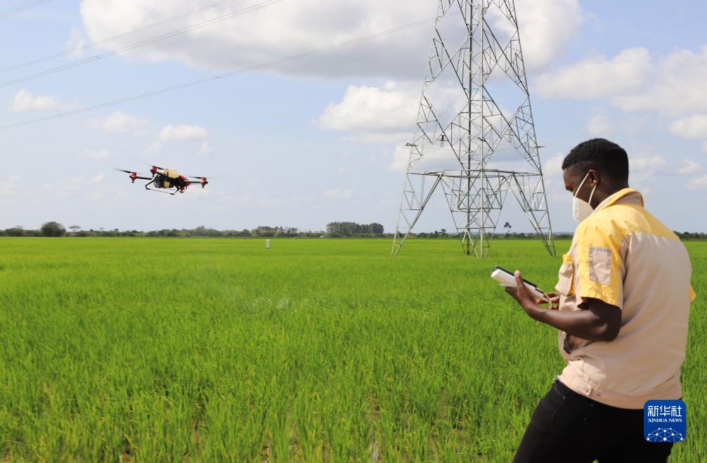 這是2021年6月2日,在烏干達卡隆古區盧卡亞鎮中億農業園,作業員赫伯特·阿加巴操控植保無人機噴灑農藥。2012年以來,中國在糧農組織南南合作框架下向烏干達派遣農業專家和技術人員,大大促進了當地農業的發展。