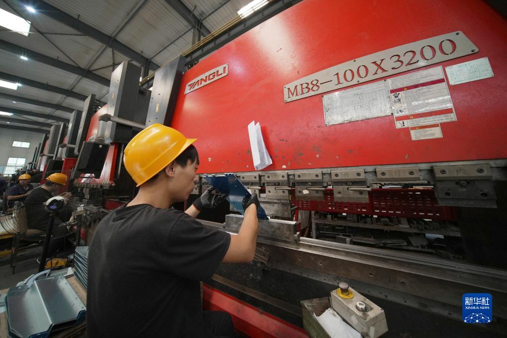 9月12日,工作人員在滄州惠邦機電產品制造有限公司生產車間加工機箱部件。
