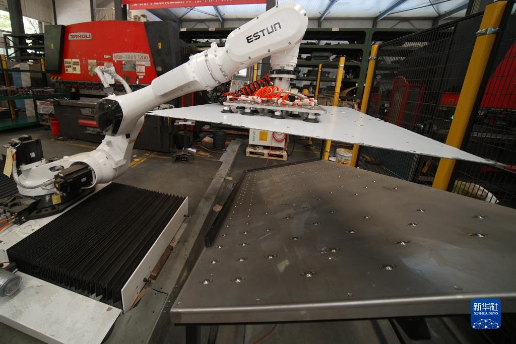 9月12日,機器人在滄州惠邦機電產品制造有限公司生產車間加工機箱部件。