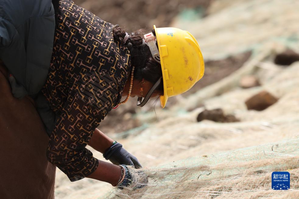 在若爾蓋縣達扎寺鎮多瑪村廢棄礦山治理點,工人在邊坡上鋪椰絲毯(8月23日攝)。
