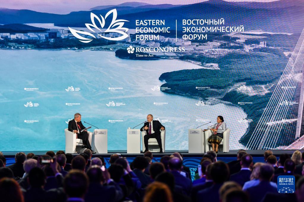 9月12日,俄羅斯總統普京(中)在第八屆東方經濟論壇全體會議上講話。