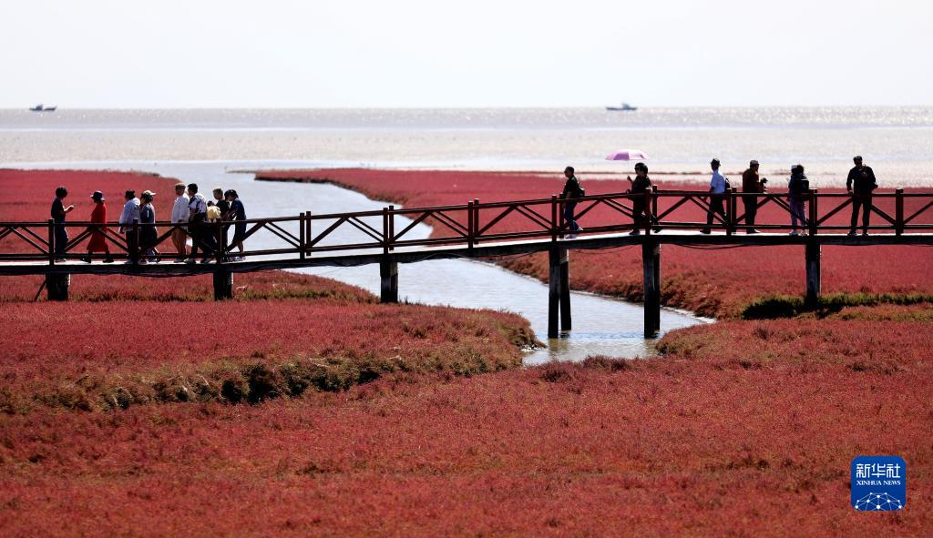 近日,遼寧省盤錦紅海灘國家風景廊道內的堿蓬草迎來最佳觀賞期,吸引了眾多游客前來觀賞游玩。